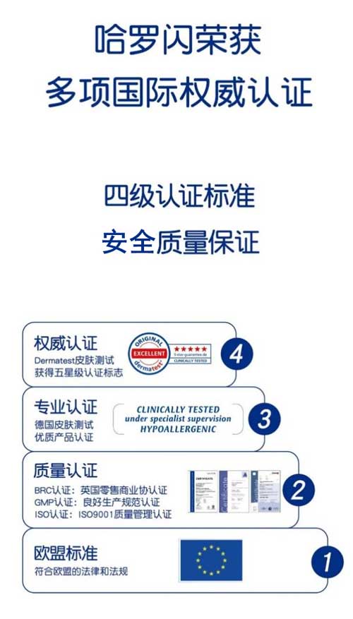 哈羅閃的產(chǎn)品研發(fā)、生產(chǎn)均符合歐盟標(biāo)準(zhǔn),并擁有德國皮膚測試的優(yōu)質(zhì)產(chǎn)品認(rèn)證;如,哈羅閃嬰兒凈護(hù)二合一洗發(fā)沐浴露、哈羅閃嬰兒柔護(hù)潤膚乳、哈羅閃嬰兒柔護(hù)按摩油、哈羅閃嬰兒溫和護(hù)膚霜等,均通過了德國權(quán)威皮膚科醫(yī)生協(xié)會認(rèn)證Dermatest的皮膚測試,并獲得5星級認(rèn)證,達(dá)到5星標(biāo)準(zhǔn)即代表產(chǎn)品通過極為嚴(yán)苛的檢測程序。