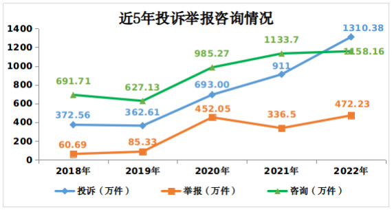 2022年,全國(guó)市場(chǎng)監(jiān)管部門通過(guò)全國(guó)12315平臺(tái)、電話、傳真、窗口等渠道共受理消費(fèi)者投訴、舉報(bào)和咨詢2940.77萬(wàn)件,同比增長(zhǎng)23.5%。其中,投訴1310.38萬(wàn)件,舉報(bào)472.23萬(wàn)件,為消費(fèi)者挽回經(jīng)濟(jì)損失45.19億元,有力保護(hù)了消費(fèi)者合法權(quán)益。主要呈現(xiàn)十大特點(diǎn):