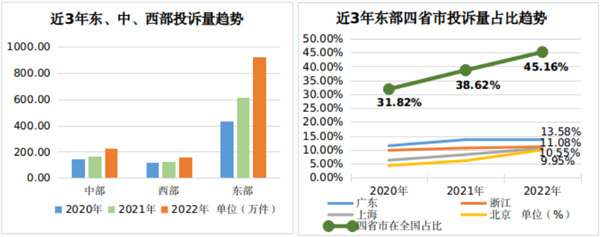 從近三年趨勢(shì)看,因平臺(tái)經(jīng)濟(jì)的跨區(qū)域擴(kuò)張、人口資本的跨區(qū)域流動(dòng)、市場(chǎng)要素的跨區(qū)域配置,廣東、浙江、上海、北京4個(gè)省市的消費(fèi)正在加速集聚。消費(fèi)投訴數(shù)量與消費(fèi)活躍水平呈正相關(guān)關(guān)系,四省市消費(fèi)投訴數(shù)量在全國(guó)的占比從2020年的31.8%增長(zhǎng)到2022年的45.16%。消費(fèi)投訴的加速集聚在一定程度上反映了消費(fèi)供給側(cè)發(fā)展的不平衡,需要進(jìn)一步恢復(fù)和擴(kuò)大中西部地區(qū)消費(fèi),推動(dòng)更高質(zhì)量、更加平衡的發(fā)展。