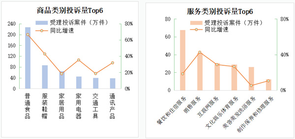 2022年,全國(guó)市場(chǎng)監(jiān)管部門共受理商品投訴862.32萬(wàn)件,占投訴的65.81%,較上年提高4.37個(gè)百分點(diǎn);服務(wù)投訴448.06萬(wàn)件,占投訴的34.19%。商品類投訴占比提升,反映了實(shí)體經(jīng)濟(jì)下行壓力下產(chǎn)品質(zhì)量問(wèn)題凸顯,其中投訴量靠前的是:普通食品、服裝鞋帽、家居用品、家用電器、交通工具、通訊產(chǎn)品,占比58.43%。服務(wù)投訴量靠前的是:餐飲住宿、銷售、互聯(lián)網(wǎng)服務(wù)、文化娛樂(lè)體育、美容美發(fā)洗浴,占比46.37%。