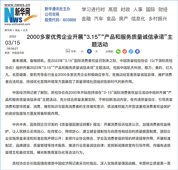 中國經(jīng)濟(jì)網(wǎng):2000多家優(yōu)秀企業(yè)開展“3·15”“產(chǎn)品和服務(wù)質(zhì)量誠信承諾”主題活動