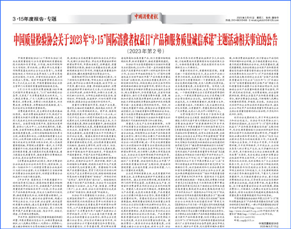 中國經(jīng)濟(jì)網(wǎng)北京3月15日訊(記者 佟明彪 蘇蘭) 春來潮涌,奮楫揚(yáng)帆。在2023年“3·15”國際消費者權(quán)益日到來之際,中國質(zhì)量檢驗協(xié)會(以下簡稱質(zhì)檢協(xié)會)組織開展2023年“3·15”“產(chǎn)品和服務(wù)質(zhì)量誠信承諾”主題活動,包括中國航天科技、格力、美的、紅九九、名臣健康、安莉芳等各行各業(yè)2000多家優(yōu)秀企業(yè)積極響應(yīng)參與,在推動經(jīng)營者質(zhì)量誠信自律、維護(hù)消費者合法權(quán)益、持續(xù)優(yōu)化營商環(huán)境等方面展現(xiàn)了質(zhì)量領(lǐng)域社團(tuán)組織在新時代的新作用。