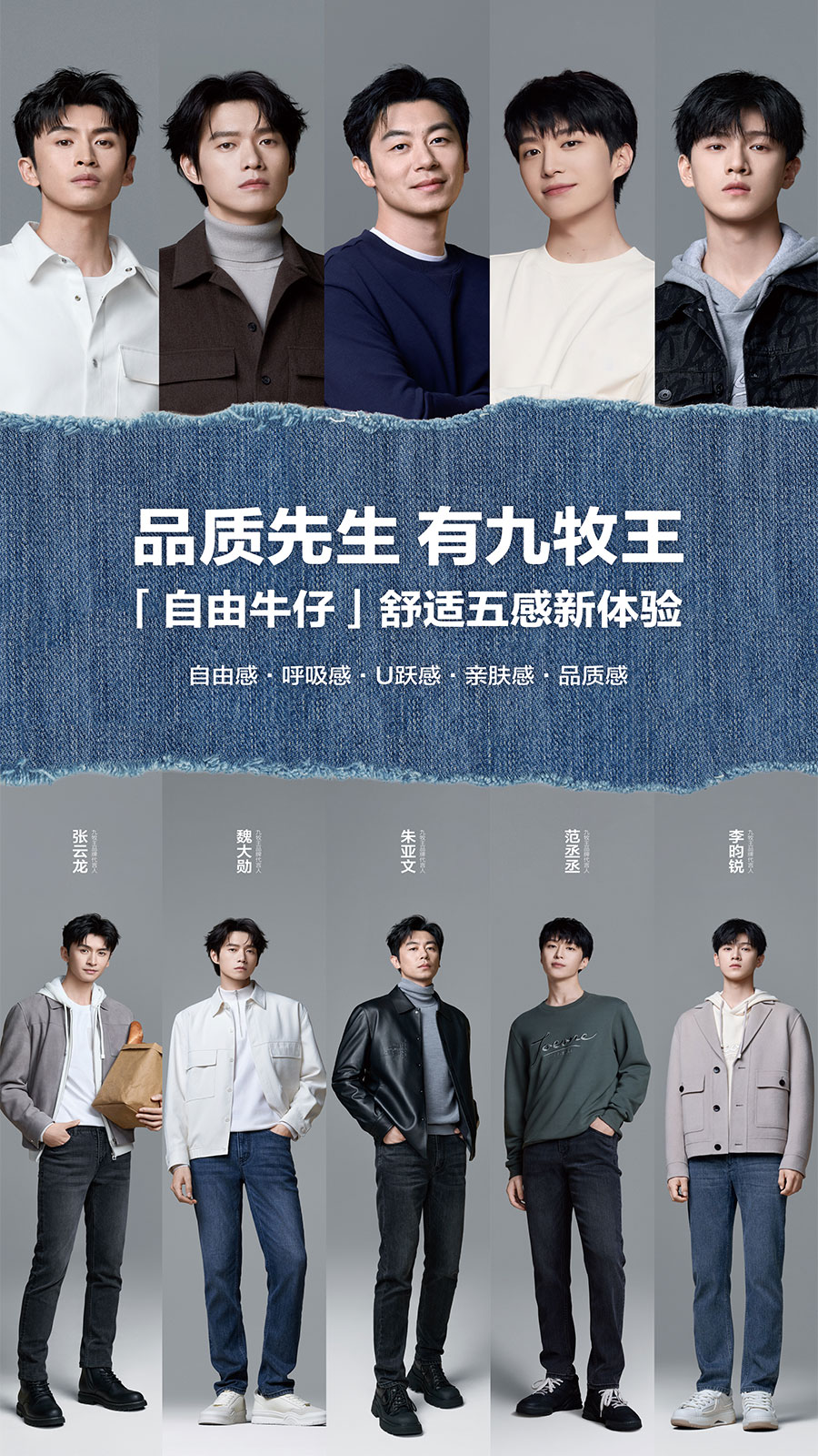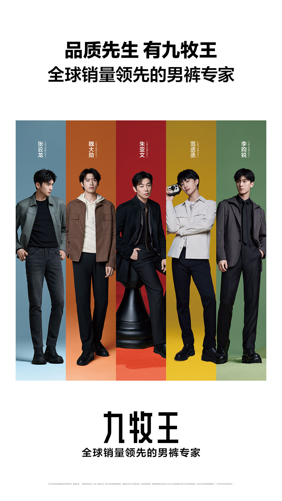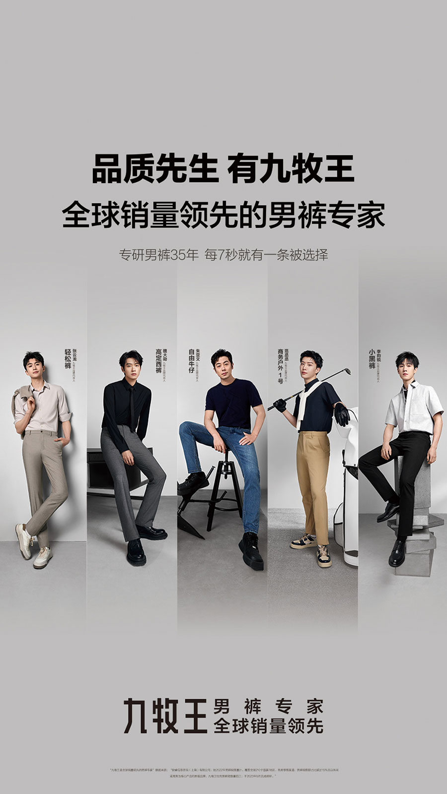 九牧王股份有限公司(股票代碼:601566),以“打造全球最好的褲子”為使命,專注男褲35年,積累1200萬人體數(shù)據(jù),沉淀6大主推褲版型,擁有多項褲領域實用新型專利,是中國男褲標準的參與制定者,男褲累計銷售超一億條。2000年至2023年,“九牧王”男褲連續(xù)24年位列全國同類產品市場綜合占有率第一,獲得“全球銷量領先的男褲專家”的品牌認證,強勢領跑中國男褲市場。2024年,九牧王正式宣布范丞丞、李昀銳、魏大勛、張云龍、朱亞文為品牌代言人,同時重磅推出滿足各種場景需求的“五褲”系列產品矩陣,開啟中國男裝領域品質新章,共同引領品質先生生活新風尚。