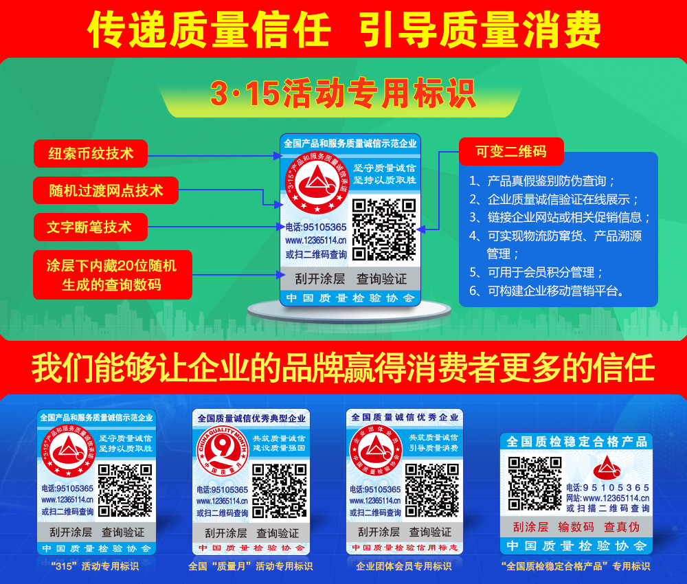 中國質(zhì)量檢驗協(xié)會防偽溯源和物流管理服務系統(tǒng)(簡稱中檢聯(lián)合質(zhì)量誠信驗證系統(tǒng))是以物聯(lián)網(wǎng)、大數(shù)據(jù)、云計算、區(qū)塊鏈和移動互聯(lián)網(wǎng)技術為基礎建設的全過程防偽溯源與質(zhì)量誠信驗證服務平臺,依托廣大技術機構的技術支撐,應用二維碼為載體,使用一物一碼防偽技術,同時采用文字、圖片和視頻等多媒體方式,完整記錄產(chǎn)品的原料來源、生產(chǎn)加工、倉儲物流和市場銷售等詳細信息,融合實現(xiàn)產(chǎn)品質(zhì)量來源可查、去向可追、責任可究的全過程追溯,切實方便企業(yè)履行質(zhì)量安全主體責任并用科技、智能化、信息化的手段去加強質(zhì)量安全風險控制,維護消費者合法權益,讓人民群眾買得放心、吃得放心、用得放心...