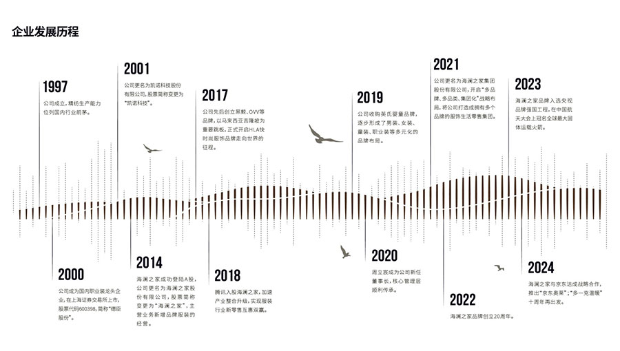 海瀾之家集團股份有限公司的前身為凱諾科技股份有限公司,成立于1997年,2000年在上海證券交易所掛牌上市,股票代碼600398。海瀾之家總部位于江蘇省江陰市新橋鎮(zhèn),是國內(nèi)服裝行業(yè)龍頭企業(yè)、全國文明單位。以“海瀾”為企業(yè)命名,寓意為“以海闊天空之博大,創(chuàng)波瀾壯美之事業(yè)”。“不斷否定自己,永遠追求卓越”是海瀾的企業(yè)精神,創(chuàng)新是海瀾的企業(yè)靈魂。