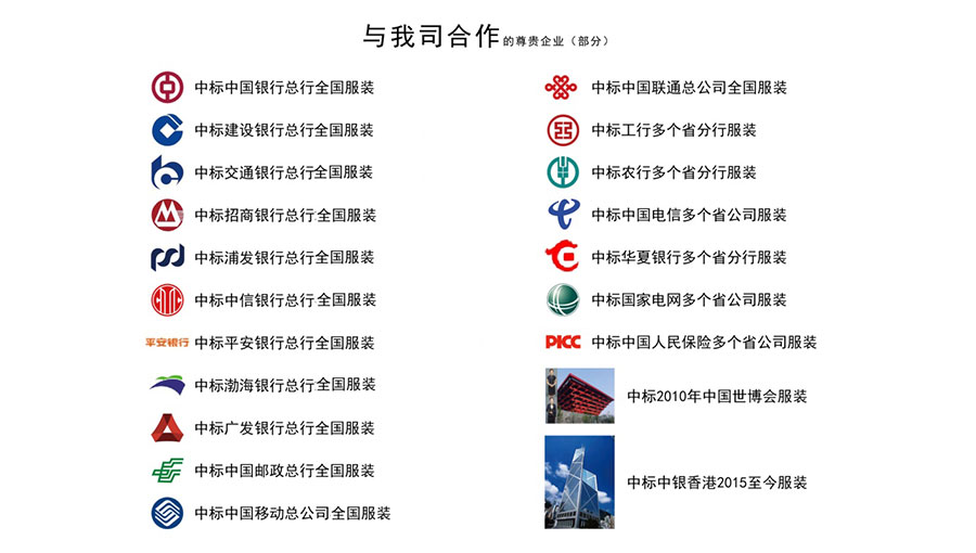 團購服務(wù)網(wǎng)絡(luò)已覆蓋全國各省、市、縣(區(qū))及鄉(xiāng)鎮(zhèn)各級地域,分公司遍及全國,有5000余家門店,10000余名服務(wù)人員,300余名量體師為制裝客戶提供全面的售后服務(wù)。持續(xù)為國內(nèi)四大國有商業(yè)銀行及交通銀行、浦發(fā)銀行、招商銀行、中信銀行、廣發(fā)銀行等一系列大型企業(yè)設(shè)計行業(yè)制服。客戶群涉及金融、保險、電力、法院、檢察院、稅務(wù)、工商、水政、技術(shù)監(jiān)督、電信、移動、聯(lián)通、郵政、公路、航空機場、地鐵、保險、券商、上市公司、環(huán)保、煙草、學(xué)校、醫(yī)院等20萬余家政府、企事業(yè)單位。更為國慶、世博會、奧運會、達沃斯論壇一系列大型盛會制作正裝。