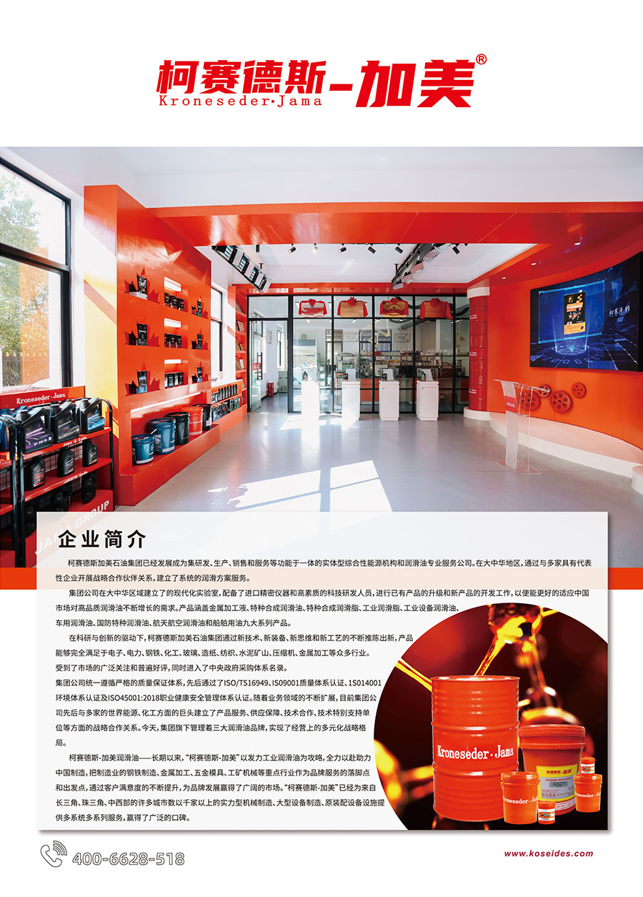 主要產(chǎn)品:柯賽德斯-加美Kroneseder?Jama、中訊高科ZHONGXUN、柯賽德Kroneseder三大品牌,產(chǎn)品涵蓋金屬加工油液、特種合成潤(rùn)滑油、特種合成潤(rùn)滑脂、工業(yè)潤(rùn)滑脂、工業(yè)設(shè)備潤(rùn)滑油、車(chē)用潤(rùn)滑油、國(guó)防特種潤(rùn)滑油、航天航空潤(rùn)滑油和船舶用油九大系列產(chǎn)品
