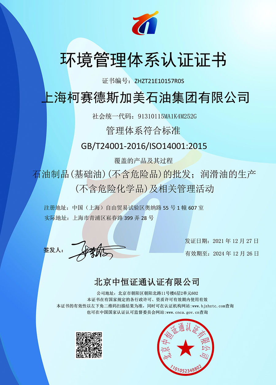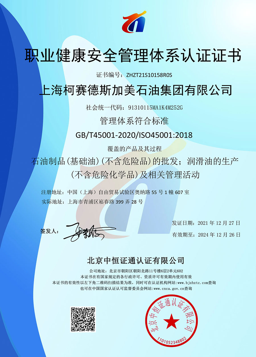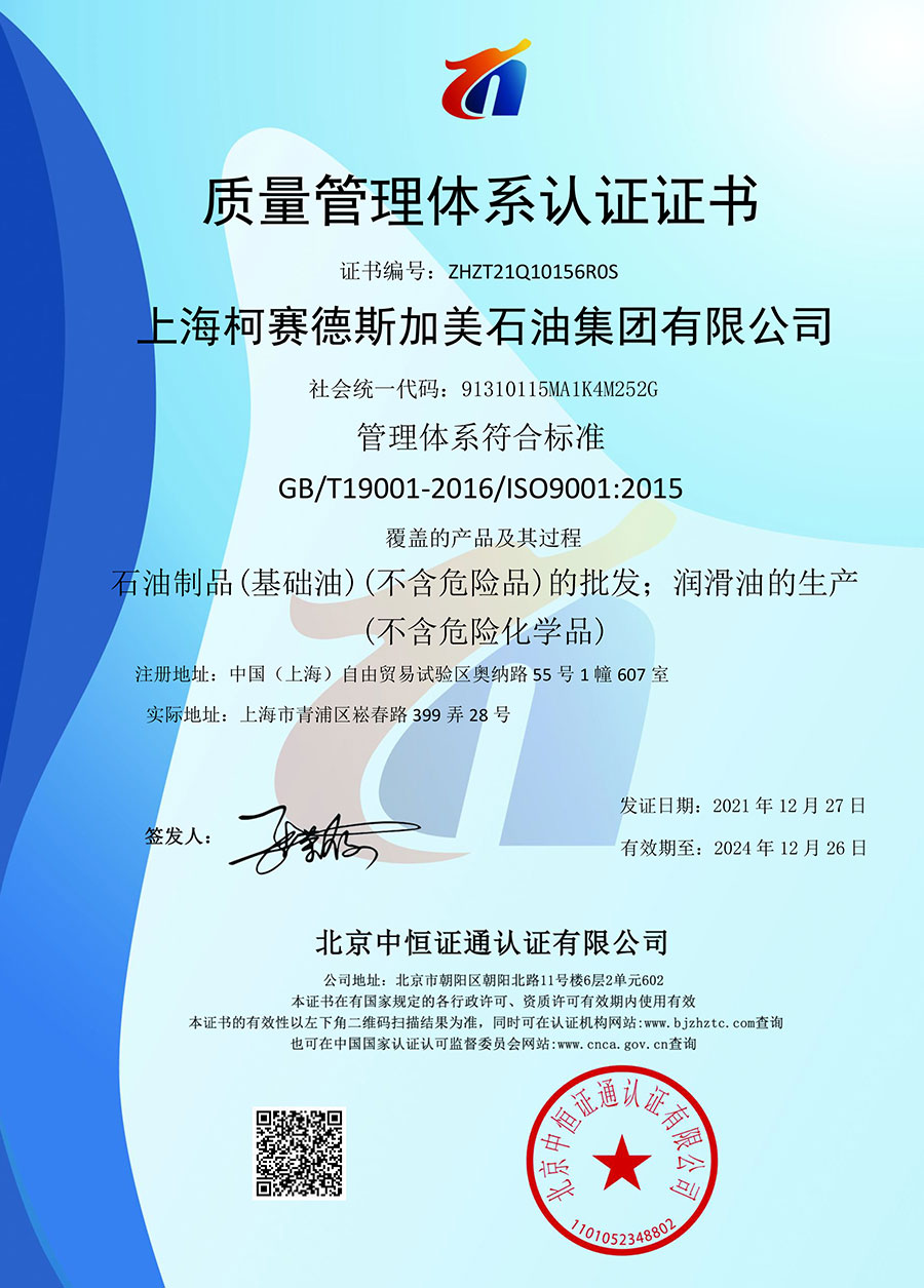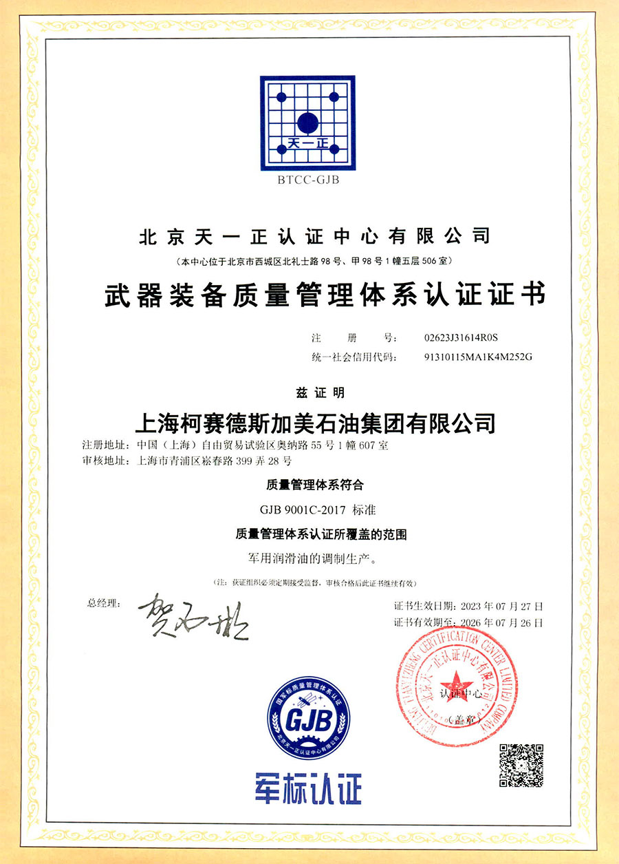 柯賽德斯集團(tuán)公司統(tǒng)一遵循嚴(yán)格的質(zhì)量保證體系,先后通過(guò)了武器裝備質(zhì)量管理體系認(rèn)證GJB9001C-2017、ISO/TS16949、IS09001質(zhì)量體系認(rèn)證、1S014001環(huán)境體系認(rèn)證及ISO45001:2018職業(yè)健康安全管理體系認(rèn)證。隨著業(yè)務(wù)領(lǐng)域的不斷擴(kuò)展,目前柯賽德斯集團(tuán)公司先后與多家世界能源、化工方面的巨頭建立了產(chǎn)品服務(wù)、供應(yīng)保障、技術(shù)合作、技術(shù)特別支持單位等方面的戰(zhàn)略合作關(guān)系。今天,柯賽德斯集團(tuán)公司旗下管理著三大潤(rùn)滑油品牌,實(shí)現(xiàn)了經(jīng)營(yíng)上的多元化戰(zhàn)略格局。