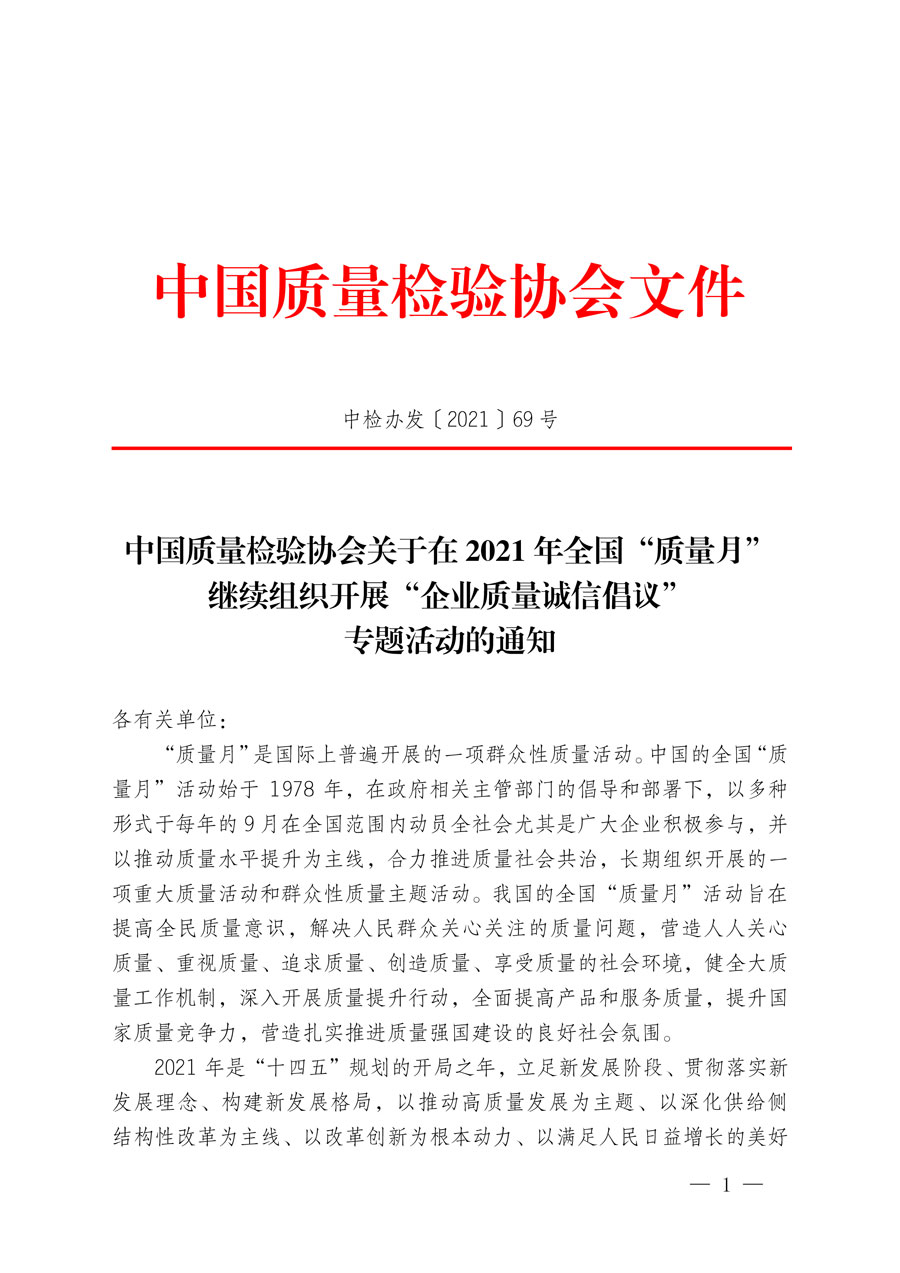 中國質(zhì)量檢驗協(xié)會作為我國質(zhì)量檢驗行業(yè)組織和質(zhì)量專業(yè)社團(tuán)機(jī)構(gòu),積極響應(yīng)2021年全國“質(zhì)量月”活動部署,切實運用“質(zhì)量月”活動的平臺影響力,充分發(fā)揮推動全社會質(zhì)量共治的橋梁紐帶作用,全面樹立質(zhì)量標(biāo)桿,大力弘揚工匠精神,全力營造質(zhì)量誠信社會氛圍,努力服務(wù)高質(zhì)量發(fā)展,謹(jǐn)此組織各行各業(yè)在質(zhì)量提升、質(zhì)量責(zé)任、質(zhì)量安全、質(zhì)量誠信、質(zhì)量發(fā)展、質(zhì)量創(chuàng)新等方面具有良好示范作用的1600家優(yōu)秀企業(yè)共同發(fā)出《2021年全國“質(zhì)量月”企業(yè)質(zhì)量誠信倡議書》。