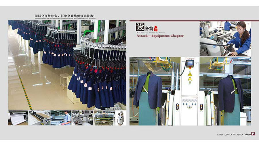 鹿港紡織板塊專注于SINFONIA、ARMONIA、REGAL精紡紗、半精紡紗、粗紡紗、花式紗等各類針織紗線、高檔精紡呢絨面料以及LANIFICIO LA MALPENGA職業(yè)裝和PALLADIO高端商務(wù)服裝的生產(chǎn),年產(chǎn)各類無結(jié)毛紗40000噸,高檔精紡面料1000萬米,西服100萬套,襯衫200萬件。鹿港主要擁有意大利產(chǎn)前紡、德國產(chǎn)手指錠緊密紡細絡(luò)聯(lián)、意大利PAFA產(chǎn)新型花捻機、法國PB33LC復精梳、多尼爾織機、意大利洗縮聯(lián)合機等國際一流設(shè)備,為高質(zhì)量產(chǎn)品生產(chǎn)奠定了堅實基礎(chǔ)。