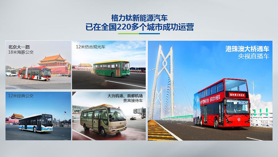 目前,格力鈦生產(chǎn)的新能源汽車于北京、杭州、武漢、青島、哈爾濱、包頭、海口等全國(guó)220多個(gè)城市運(yùn)營(yíng)。2014年,仿古鐺鐺車榮膺第22屆北京APEC會(huì)議官方指定用車、登陸北京環(huán)天安門旅游觀光線。2016年,雙層巴士榮膺第二屆中美低碳峰會(huì)指定用車、登陸國(guó)內(nèi)首條純電動(dòng)雙層觀光車線路——北京城市旅游觀光3線。2017年,18米海豚公交車投入北京長(zhǎng)安街1路運(yùn)營(yíng)。2018年,港珠澳大橋正式通車,雙層巴士擔(dān)綱中央廣播電視總臺(tái)直播車,成為首輛駛上港珠澳大橋的大巴車。
