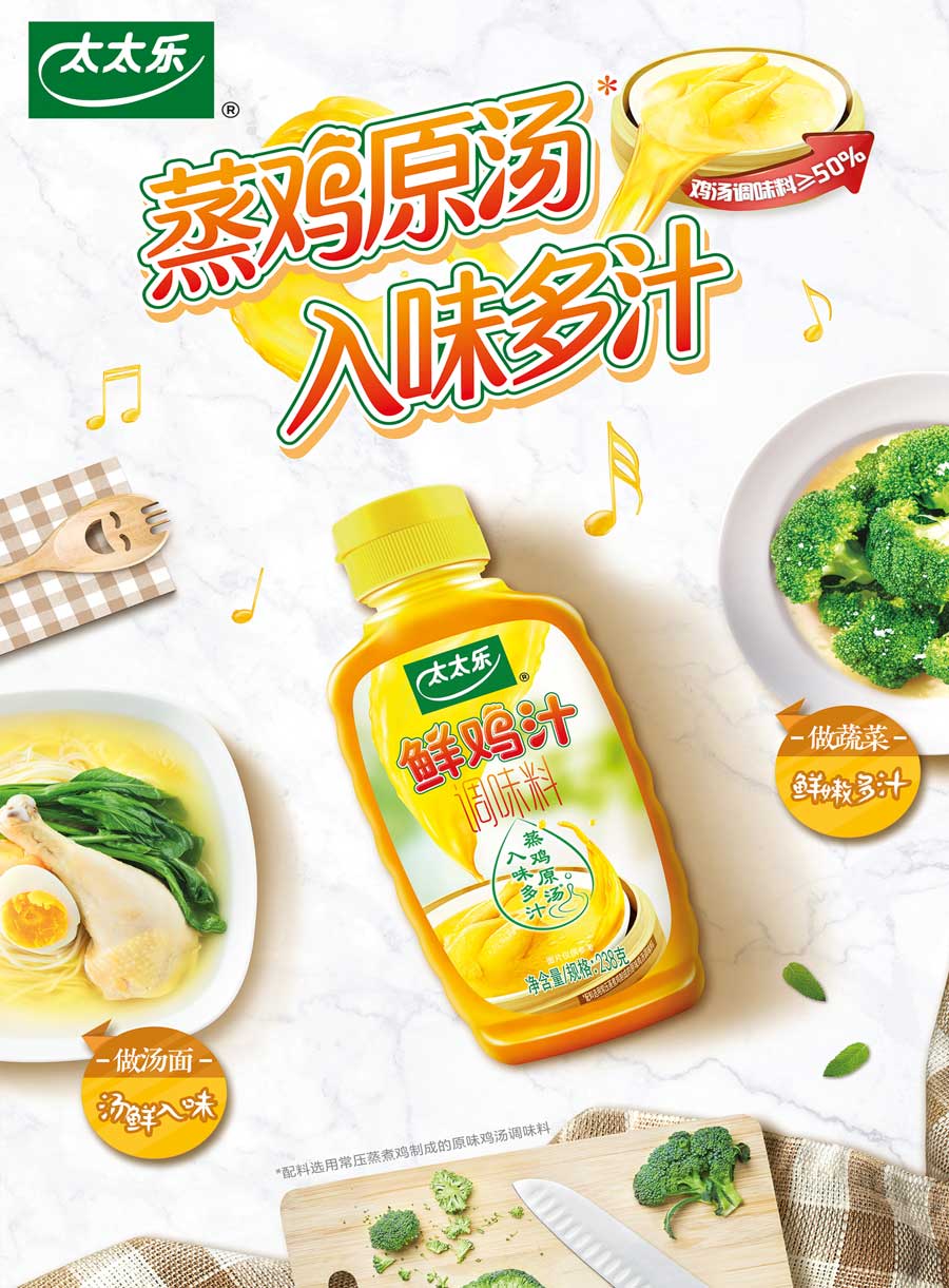 主要產(chǎn)品:三鮮雞精、鮮雞汁、太太樂原味鮮醬油系列、湯之鮮系列、菜譜式調(diào)料系列、蠔油系列、天天旺等