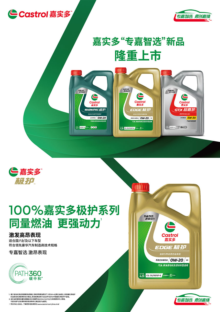 嘉實(shí)多是全球領(lǐng)先的潤(rùn)滑油解決方案供應(yīng)商。121年來,嘉實(shí)多始終是品質(zhì)、科技和環(huán)保的先鋒,獲得了全球億萬用戶的信賴。無論在乘用車、摩托車、還是商用車等領(lǐng)域,嘉實(shí)多都擁有行業(yè)領(lǐng)先的潤(rùn)滑油產(chǎn)品。嘉實(shí)多極護(hù)、嘉實(shí)多磁護(hù)、嘉實(shí)多超嘉護(hù)產(chǎn)品性能全面升級(jí),并且全面適用符合國(guó)六b排放標(biāo)準(zhǔn)的車型。