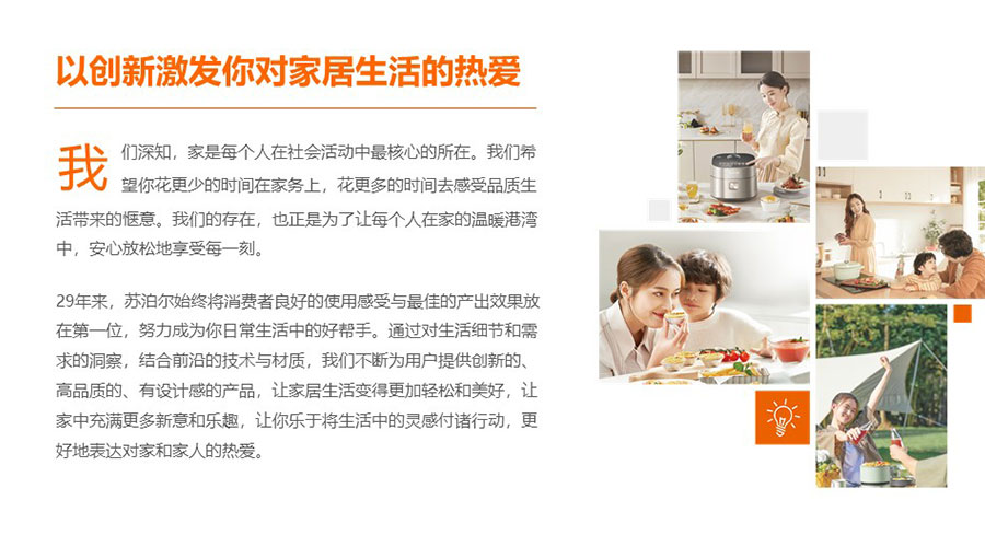 蘇泊爾始終貫徹和奉行“讓每一天的生活更輕松”的企業(yè)使命、秉承“以人為本、客戶導(dǎo)向、系統(tǒng)規(guī)劃、高效執(zhí)行”的經(jīng)營理念,踐行“愛國、謙遜、務(wù)實(shí)、創(chuàng)新、超越”的企業(yè)作風(fēng),追求卓越品質(zhì),堅(jiān)持創(chuàng)新能力,努力成為引領(lǐng)中國炊具、廚房電器行業(yè)的研發(fā)制造商。