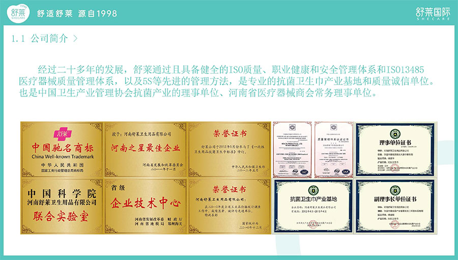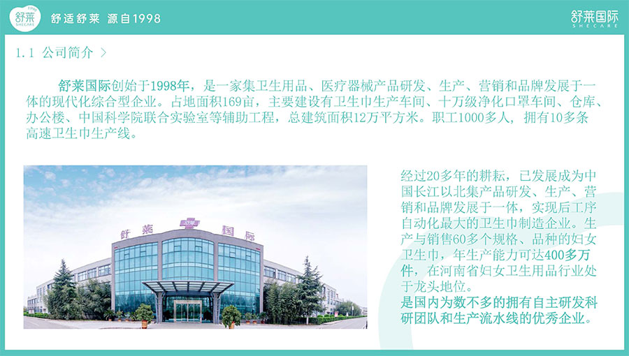 河南舒萊衛(wèi)生用品有限公司成立于1998年,位于許昌市襄城縣產(chǎn)業(yè)集聚區(qū),是一家集自主研發(fā)、生產(chǎn)、銷售及服務(wù)于一體的中原地區(qū)及周邊省份最大的婦女衛(wèi)生巾和婦女衛(wèi)生護墊的專業(yè)生產(chǎn)企業(yè)。舒萊嚴格按照現(xiàn)代化企業(yè)管理模式運行,實行董事會領(lǐng)導(dǎo)下的總經(jīng)理全面負責(zé)制,建立健全各項規(guī)章制度和質(zhì)量保證體系。