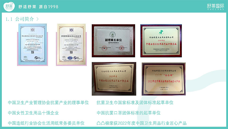 2022年,該公司“舒萊”、“凸凸棉”品牌被中國造紙學(xué)會評定為“2022年度中國衛(wèi)生用品行業(yè)匠心產(chǎn)品”;