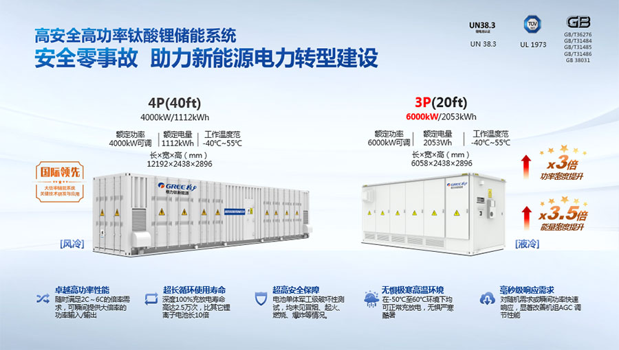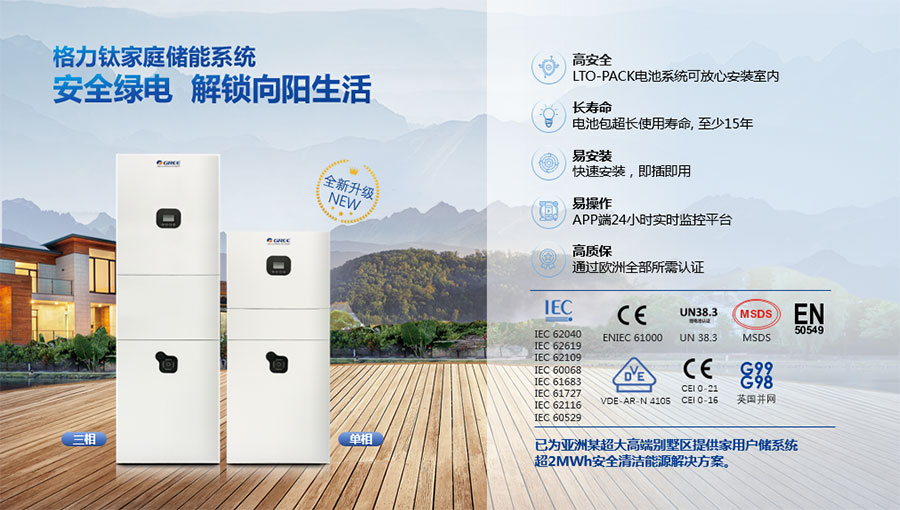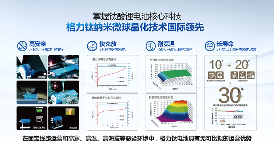 鈦酸鋰電池技術(shù)是新能源行業(yè)唯一獲得中國(guó)專利獎(jiǎng)金獎(jiǎng)的鋰電池產(chǎn)品技術(shù),其應(yīng)用于儲(chǔ)能電池和動(dòng)力電池具有超高安全性,在快充放、耐寬溫、長(zhǎng)壽命等方面同樣具有卓越的性能。格力鈦電池系列產(chǎn)品具有不起火不爆炸高安全、6分鐘快充放、-50℃至60℃耐寬溫特性,循環(huán)充放電次數(shù)高達(dá)30000多次,使用壽命長(zhǎng)達(dá)30年。格力鈦電池經(jīng)利鋸切割、尖針穿刺、強(qiáng)力擠壓、電鉆沖孔、短路充放電、高溫加熱、槍擊等極限條件測(cè)試,均未發(fā)生冒煙、起火、燃燒、爆炸等現(xiàn)象。