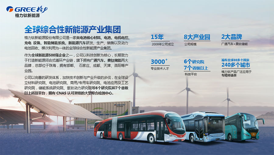 格力鈦新能源股份有限公司是一家集鋰電池核心材料、電池、電機(jī)電控、充電設(shè)備、智能儲(chǔ)能系統(tǒng)、新能源汽車研發(fā)、生產(chǎn)、銷售以及動(dòng)力電池回收梯次利用為一體的全球綜合性新能源產(chǎn)業(yè)集團(tuán)。公司以科技創(chuàng)新為核心,打造新能源閉合式循環(huán)產(chǎn)業(yè)鏈,旗下?lián)碛袕V通汽車、奧鈦儲(chǔ)能兩大品牌,總部位于珠海,擁有邯鄲、石家莊、成都、天津、洛陽(yáng)、南京等產(chǎn)業(yè)園。
