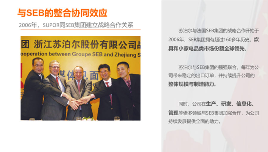 蘇泊爾始終貫徹和奉行“讓每一天的生活更輕松”的企業(yè)使命、秉承“以人為本、客戶導向、系統規(guī)劃、高效執(zhí)行”的經營理念,踐行“愛國、謙遜、務實、創(chuàng)新、超越”的企業(yè)作風,追求卓越品質,堅持創(chuàng)新能力,努力成為引領中國炊具、廚房電器行業(yè)的研發(fā)制造商。