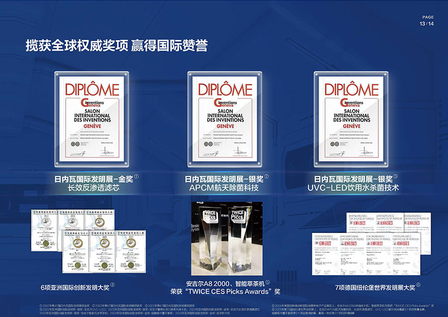 38年間,安吉爾堅(jiān)持科技創(chuàng)新并主導(dǎo)行業(yè)技術(shù)升級,參與制定17項(xiàng)國家及行業(yè)標(biāo)準(zhǔn),獲得900余項(xiàng)技術(shù)專利,建成4大水質(zhì)實(shí)驗(yàn)室。2023年,該企業(yè)憑借創(chuàng)新實(shí)力包攬全球9項(xiàng)發(fā)明大獎,包括3項(xiàng)日內(nèi)瓦國際發(fā)明展獎項(xiàng)與6項(xiàng)亞洲創(chuàng)新發(fā)明展獎項(xiàng)。