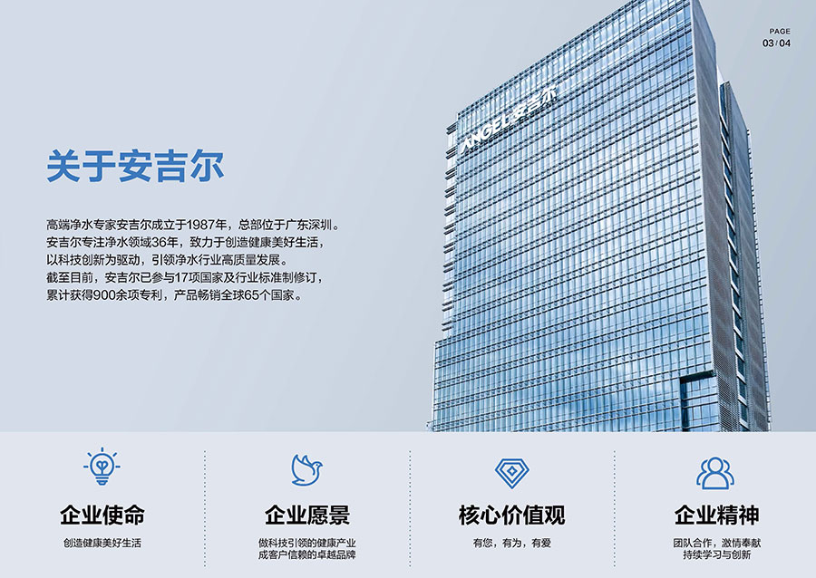 安吉爾成立于1987年,總部設(shè)立于廣東深圳。該品牌深耕凈水領(lǐng)域38年,其專業(yè)凈水器產(chǎn)品銷量持續(xù)領(lǐng)先。目前該企業(yè)已構(gòu)建超10000家渠道門店網(wǎng)絡(luò),其中包含近2000家專賣店,產(chǎn)品暢銷全球65個國家,累計(jì)服務(wù)超500萬活躍用戶。