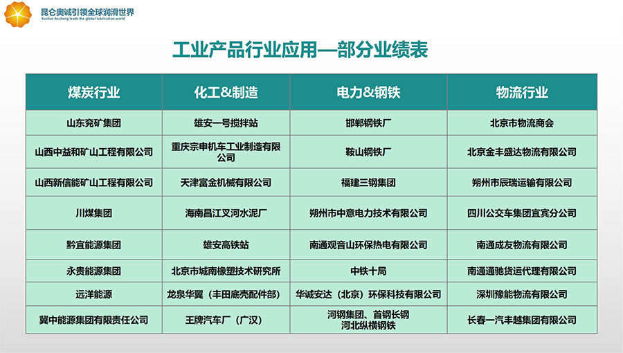 經(jīng)過多年的發(fā)展,昆侖奧誠的品牌影響力不斷擴(kuò)大,銷量顯著增長,實(shí)力不斷增強(qiáng)。昆侖奧誠在全國各地建立了多層銷售網(wǎng)絡(luò),用戶遍布汽車制造、工程機(jī)械制造、鋼鐵、礦山綜合采礦設(shè)備、熱發(fā)電、工程機(jī)械、船舶、紡織機(jī)械設(shè)備等工業(yè)產(chǎn)品,覆蓋工程機(jī)械油、汽車油、工業(yè)油、油脂、特種油等多個石化領(lǐng)域。