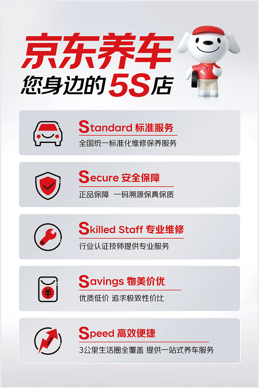 在養(yǎng)車標準方面京東養(yǎng)車秉承有保障、更專業(yè)的品牌服務(wù)理念,推出全新5S服務(wù)標準。從多個維度保障客戶權(quán)益,提升服務(wù)品質(zhì)。