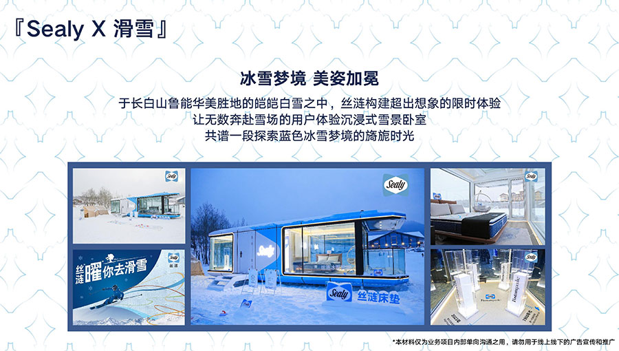 于長白山魯能華美勝地的皚皚白雪之中,絲漣構(gòu)建超出想象的限時體驗,讓無數(shù)奔赴雪場的用戶體驗沉浸式雪景臥室,共譜一段探索藍(lán)色冰雪夢境的旖旎時光。