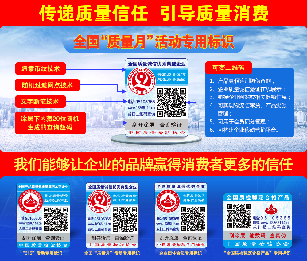 中國質(zhì)量檢驗協(xié)會防偽溯源和物流管理服務系統(tǒng)(簡稱中檢聯(lián)合質(zhì)量誠信驗證系統(tǒng))是以物聯(lián)網(wǎng)、大數(shù)據(jù)、云計算、區(qū)塊鏈和移動互聯(lián)網(wǎng)技術為基礎建設的全過程防偽溯源與質(zhì)量誠信驗證服務平臺,依托廣大技術機構的技術支撐,應用二維碼為載體,使用一物一碼防偽技術,同時采用文字、圖片和視頻等多媒體方式,完整記錄產(chǎn)品的原料來源、生產(chǎn)加工、倉儲物流和市場銷售等詳細信息,融合實現(xiàn)產(chǎn)品質(zhì)量來源可查、去向可追、責任可究的全過程追溯,切實方便企業(yè)履行質(zhì)量安全主體責任并用科技、智能化、信息化的手段去加強質(zhì)量安全風險控制,維護消費者合法權益,讓人民群眾買得放心、吃得放心、用得放心...