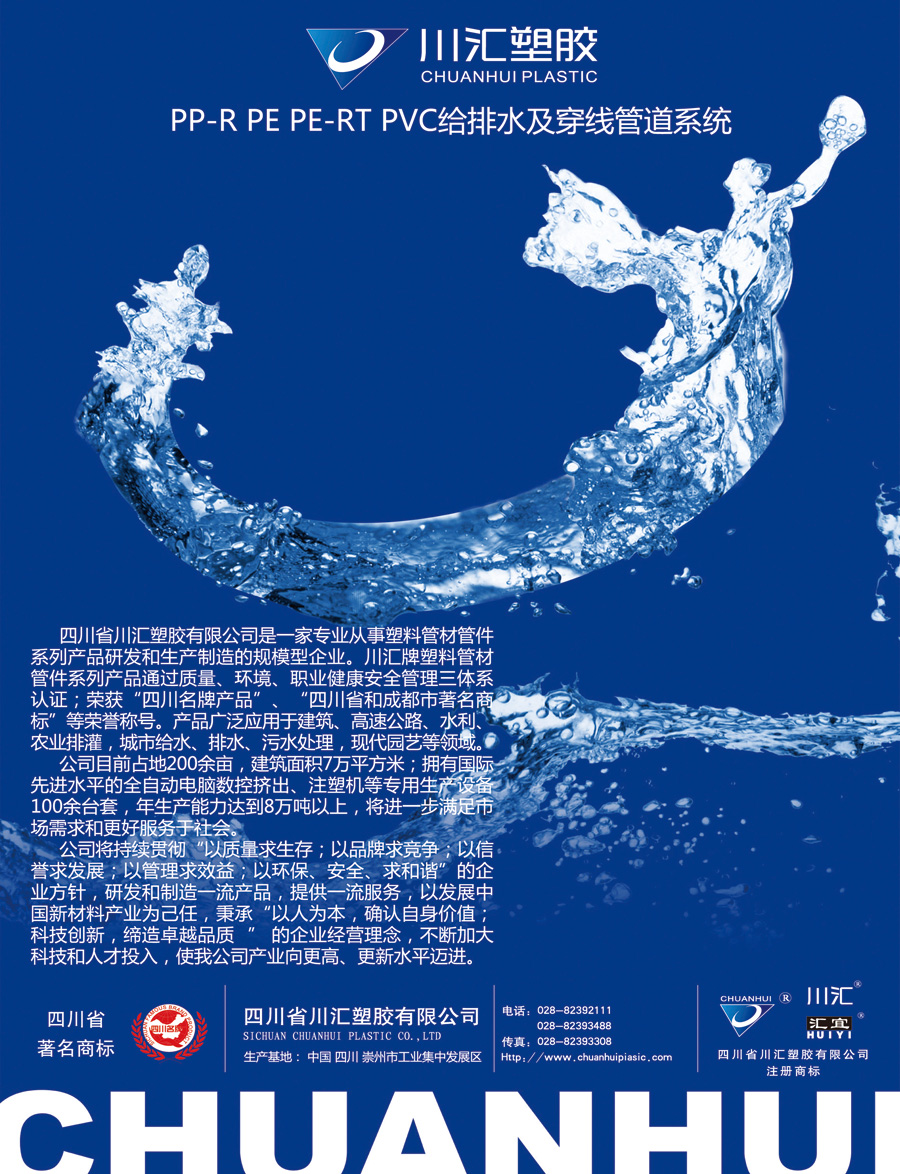 四川省川匯塑膠有限公司是一家專業(yè)從事塑料管材管件(PVC給排水管材、管件;電氣安裝用阻燃PVC塑料平導(dǎo)管(電工套管及配件);冷熱水用聚丙烯(PP-R)管材、管件;給水用聚乙烯(PE)管材、管件;燃?xì)庥寐竦鼐垡蚁≒E)管材、管件;高密度聚乙烯(HDPE)雙壁纏繞管材、管件;埋地排水用鋼帶增強(qiáng)聚乙烯(PE)螺旋波紋管;聚乙烯(PE)雙壁波紋管材;冷熱水用PE-RT耐熱聚乙烯地暖管材、管件;C-PVC地埋式高壓電力電纜保護(hù)管;川匯牌“匯騰”家裝精品等)、塑膠型材、塑鋼門窗、金屬管道、金屬管道的接頭及配件、球墨鑄鐵管及管件系列產(chǎn)品研發(fā)和生產(chǎn)制造的規(guī)模型企業(yè)。其產(chǎn)品廣泛應(yīng)用于建筑、高速公路、水利、農(nóng)業(yè)排灌,城市給水、排水、污水處理,現(xiàn)代園藝等領(lǐng)域。