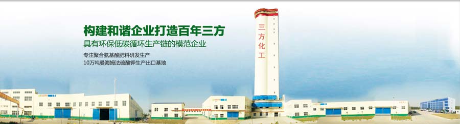 山東三方化工集團有限公司是一家以生產化肥為主,集化工、科研、房產開發(fā)、金融商貿及農化服務于一體的大型集團化企業(yè)。公司成立于1975年,現(xiàn)有總資產8億元,職工1200余人,占地面積1000余畝。主要產品有復合肥、硫酸鉀、鹽酸、精細化工等產品,年綜合生產能力120萬噸,是北方主要的曼海姆法硫酸鉀生產基地,產品遠銷日本、澳大利亞、埃及、東南亞等海外國家和地區(qū)。