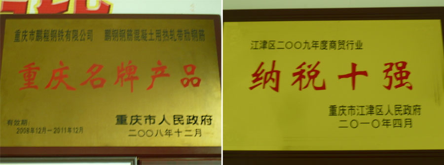 “鵬鋼牌”鋼筋混凝土用熱軋帶肋鋼筋采用了國際上流行的四位一體短流先進生產工藝。2012年公司生產的熱軋帶肋鋼筋HRB400高強鋼筋取得生產許可證,被重慶市政府評為“重慶名牌”產品。“鵬鋼牌”鋼筋混凝土用熱軋帶肋鋼筋每年均受江津區(qū)質量技術監(jiān)督局、重慶市質量技術監(jiān)督局等部門的監(jiān)督抽查,合格率達100%。在全市同行中,“鵬鋼牌”鋼筋混凝土用熱軋帶肋鋼筋無論是產量、質量、市場占有率在全市都名列第一。