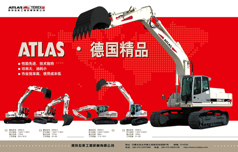 中國阿特拉斯是高新技術企業(yè),主要生產和銷售具有世界先進水平的ATLAS 20噸級以上中大型及礦用挖掘機。該系列挖掘機具有“性能先進、技術獨特;功率大、油耗??;作業(yè)效率高、使用成本低”的突出特點,可廣泛應用于礦山開采及城鄉(xiāng)建設。