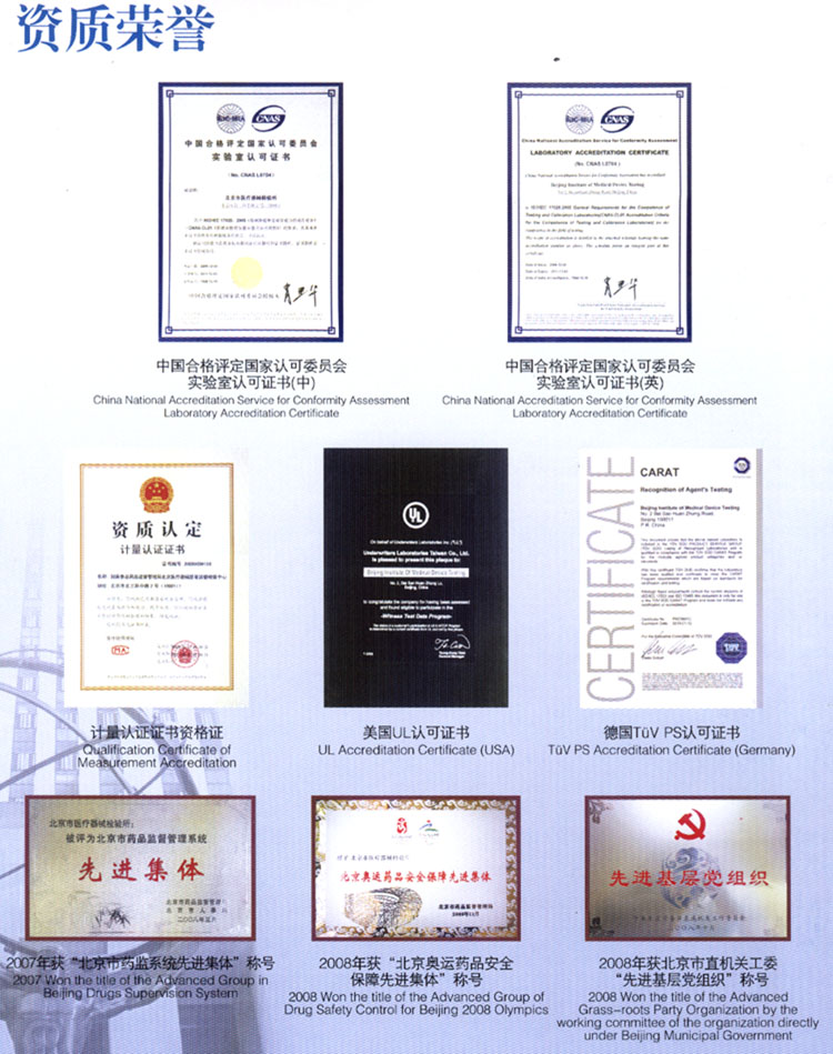 北京市醫(yī)療器械檢驗(yàn)所(國家食品藥品監(jiān)督管理局北京醫(yī)療器械質(zhì)量監(jiān)督檢驗(yàn)中心,以下簡稱“北檢所”)是中國合格評定國家認(rèn)可委員會(CNAS)、中國國家認(rèn)證認(rèn)可監(jiān)督管理委員會(CNCA)、國家食品藥品監(jiān)督管理局(SFDA)等部門認(rèn)可授權(quán)的一所綜合性醫(yī)療器械產(chǎn)品檢測機(jī)構(gòu)。經(jīng)CNAS授權(quán)的檢驗(yàn)范圍涵蓋醫(yī)用電子、醫(yī)用射線、核醫(yī)學(xué)、電聲學(xué)、體外診斷系統(tǒng)、一次性醫(yī)療產(chǎn)品、醫(yī)用防護(hù)用品、醫(yī)用橡膠制品、口腔材料、生物安全柜、電磁兼容、生物相容性等專業(yè)領(lǐng)域,檢驗(yàn)項(xiàng)目涉及472項(xiàng);經(jīng)SFDA授權(quán)檢測項(xiàng)目達(dá)599項(xiàng),承擔(dān)著授權(quán)范圍內(nèi)醫(yī)療器械產(chǎn)品監(jiān)督抽驗(yàn)檢驗(yàn)、注冊檢驗(yàn)、認(rèn)證檢驗(yàn)、進(jìn)出口商品檢驗(yàn)、科技成果鑒定檢驗(yàn)以及委托檢驗(yàn)、仲裁檢驗(yàn)等檢測任務(wù);2002年,成為中國質(zhì)量認(rèn)證中心(CQC)簽約實(shí)驗(yàn)室,承擔(dān)醫(yī)用X射線診斷設(shè)備、心電圖機(jī)、血液透析裝置和橡膠避孕套的強(qiáng)制性產(chǎn)品安全認(rèn)證檢測任務(wù)。此外,該所先后獲得TüV PS、UL等國際權(quán)威認(rèn)證機(jī)構(gòu)的認(rèn)可,是目前國內(nèi)開展檢驗(yàn)業(yè)務(wù)專業(yè)最全面的醫(yī)療器械檢驗(yàn)機(jī)構(gòu)。