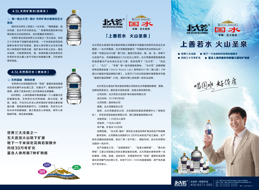 北大荒五大連池礦泉水股份有限公司成立于2012年3月8日,隸屬于北大荒集團(tuán)總公司,其股東為:北大荒集團(tuán)總公司、北京國(guó)經(jīng)財(cái)富投資管理中心(有限合伙)、華農(nóng)農(nóng)資連鎖股份有限公司、營(yíng)口港務(wù)集團(tuán)有限公司。其注冊(cè)資金1.25億元人民幣,總投資11億元人民幣。北大荒五大連池礦泉水股份有限公司擁有占地面積20.3萬(wàn)平方米的生產(chǎn)加工基地,生產(chǎn)和生活基礎(chǔ)設(shè)施完善,由主廠房(生產(chǎn)線)、塑膠車間、動(dòng)力車間、辦公樓、食堂宿舍及相關(guān)附屬設(shè)施組成。其經(jīng)營(yíng)范圍為“北大荒•國(guó)水”系列五大連池天然礦泉水的生產(chǎn)和銷售,礦泉水年產(chǎn)量100萬(wàn)噸。