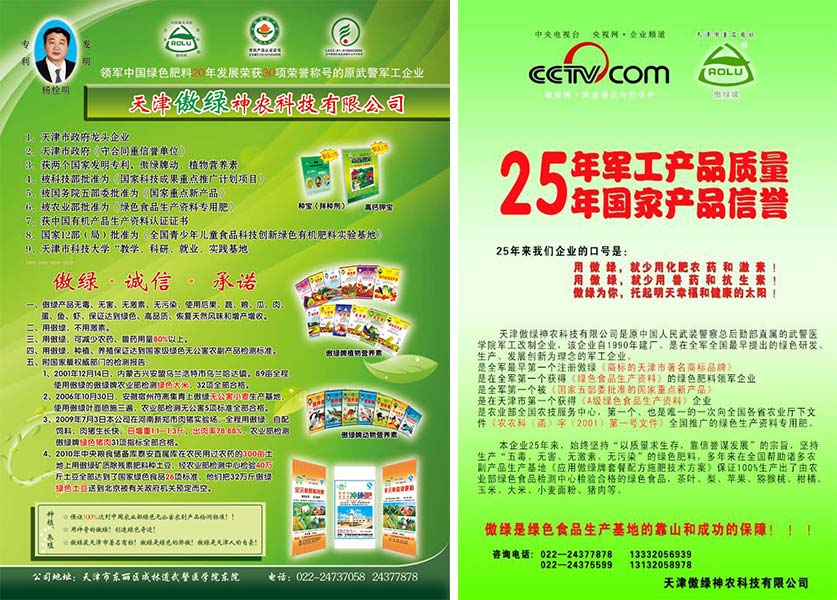 傲綠公司有15年的軍工發(fā)展史和改制后10年的民營市場共計(jì)25年的歷程,是專門生產(chǎn)和研發(fā)綠色農(nóng)業(yè)生產(chǎn)資料的高科技企業(yè)實(shí)體。董事長楊栓明先生發(fā)明的傲綠牌動(dòng)、植物營養(yǎng)素,動(dòng)、植物礦質(zhì)除殘素獲國家四項(xiàng)發(fā)明專利,曾獲天津市政府頒發(fā)的“科技進(jìn)步獎(jiǎng)”、“天津市著名商標(biāo)”,國家科技部頒發(fā)的《科技成果重點(diǎn)推廣計(jì)劃指南》證書,國家五部委聯(lián)合頒發(fā)《國家重點(diǎn)新產(chǎn)品》證書,被中國綠色食品發(fā)展中心認(rèn)定為《A級綠色食品生產(chǎn)資料》,被中國科協(xié)授予《全國百項(xiàng)農(nóng)業(yè)精品推薦項(xiàng)目》以及國內(nèi)外博覽會上多項(xiàng)金獎(jiǎng),動(dòng)物營養(yǎng)素2005年4月被天津市飼料辦批準(zhǔn)為無公害予混合飼料。