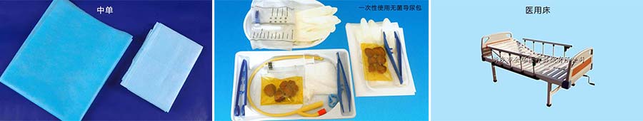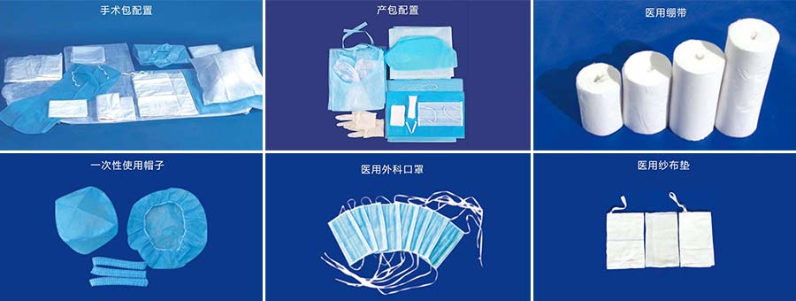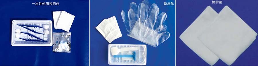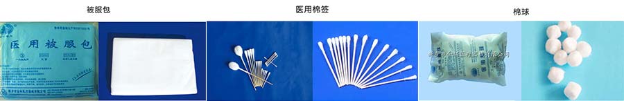 主要產(chǎn)品:金環(huán)騰月無菌產(chǎn)包、手術(shù)包、導尿包、換藥包、紗布塊、無菌醫(yī)用墊等