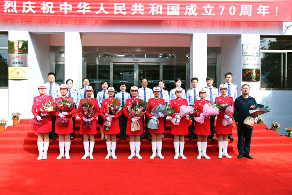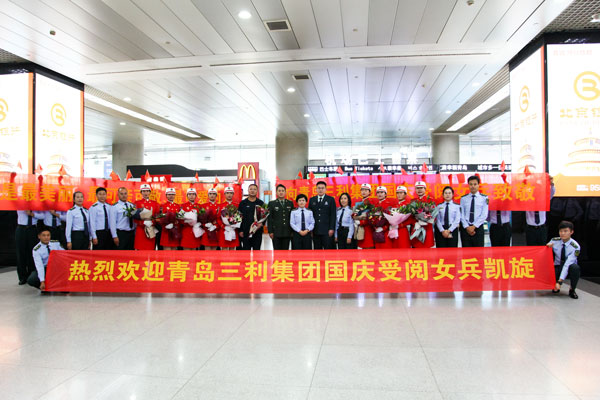 2019年10月5日是個(gè)歡樂的日子,青島流亭機(jī)場,9名身著紅色受閱服裝的姑娘們一下飛機(jī),就受到了熱烈歡迎,幾名姑娘在與前來迎接她們的同事?lián)肀r(shí)激動地流下了淚水。這9名成員是青島三利集團(tuán)參加慶祝中華人民共和國成立70周年大閱兵的鏗鏘玫瑰。就在幾天前,她們作為民兵方隊(duì)成員走過天安門廣場,接受祖國和人民檢閱,成為許多人眼中一道靚麗的風(fēng)景線。