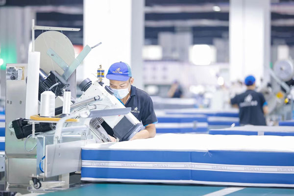 生產(chǎn)效率如虎添翼,每天生產(chǎn)近5000個(gè)型號(hào)、軟硬完全不同的床墊,原先需要1010人的工作量如今不超過(guò)600人即可完成,產(chǎn)能提升了30%-60%,生產(chǎn)周期縮短45.2%,解放人工的同時(shí)將每張床墊成本下降了9%-59%。