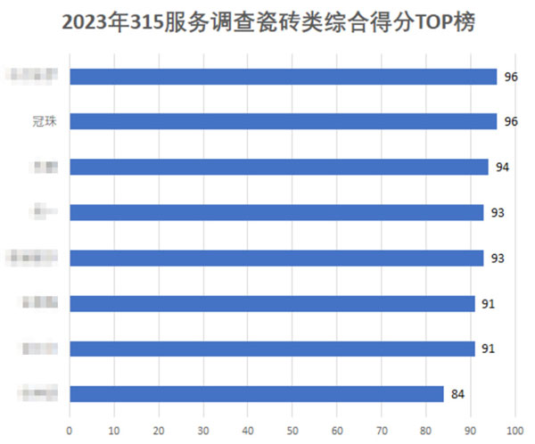 在2023年的315家居服務(wù)摸底中,共計調(diào)查了22家瓷磚品牌,綜合平均分達(dá)80.55分。其中,冠珠瓷磚以96分的成績高居第一位,再度蟬聯(lián)“年度家居行業(yè)服務(wù)榜樣”獎項。