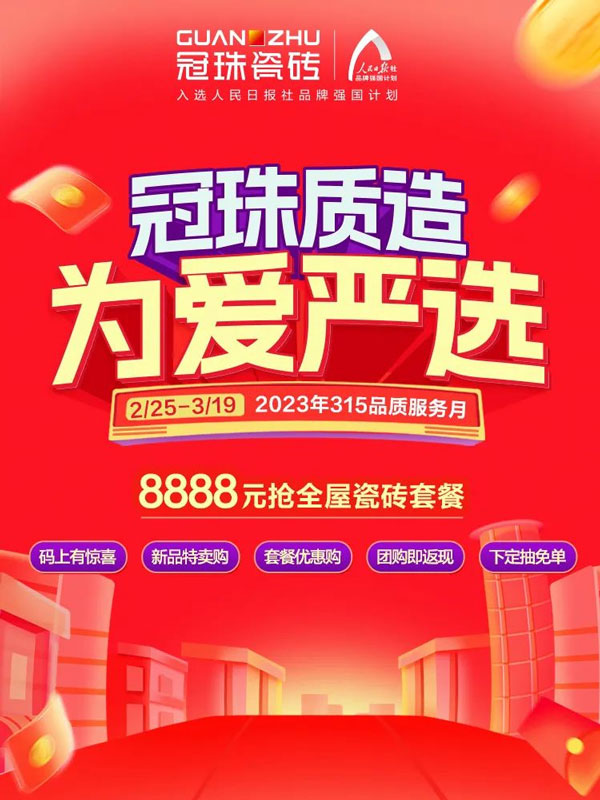 一直以來,冠珠始終堅持“嚴(yán)”字當(dāng)頭,講中國故事,打造新國貨品牌形象。被認(rèn)可的背后是優(yōu)質(zhì)的服務(wù)與口碑的沉淀。3月9-15日,冠珠瓷磚315品質(zhì)服務(wù)月再出發(fā),為愛嚴(yán)選,為品質(zhì)發(fā)聲。用更好的產(chǎn)品、更好的服務(wù)、更好的體驗,筑就國人更美好的家。