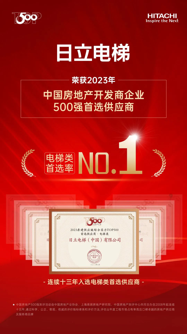 3月23日,2023房地產(chǎn)開發(fā)企業(yè)綜合實(shí)力測(cè)評(píng)成果正式發(fā)布, “2023中國房地產(chǎn)開發(fā)企業(yè)綜合實(shí)力TOP500”“TOP500房企首選供應(yīng)商”等測(cè)評(píng)榜單揭曉,日立電梯以電梯品牌首選率18%,再次位居中國房地產(chǎn)Top500首選電梯類供應(yīng)商榜首。