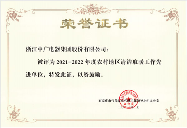日前,浙江中廣電器集團(tuán)股份有限公司榮獲由石家莊市氣代煤電代煤工作領(lǐng)導(dǎo)小組辦公室授予的“2021-2022年度農(nóng)村地區(qū)清潔取暖工作先進(jìn)單位”榮譽稱號,以此表彰以中廣電器集團(tuán)在當(dāng)?shù)剞r(nóng)村地區(qū)清潔取暖工作中所作出的杰出貢獻(xiàn)。