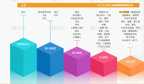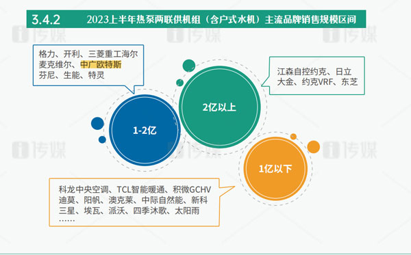 作為“熱泵行業(yè)領(lǐng)軍品牌”的中廣歐特斯,從2018年起逐步轉(zhuǎn)型向暖通與舒適家居領(lǐng)域滲透。經(jīng)過多年積累,中廣歐特斯在2023年上半年依然保持著逆勢而上的發(fā)展優(yōu)勢,在主流品牌3億以下銷售規(guī)模中占據(jù)頭部位置。