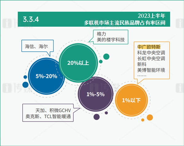作為中央空調(diào)市場的絕對權(quán)重品類,多聯(lián)機(jī)一直以來都能以一己之力決定行業(yè)的風(fēng)向,而2023上半年,多聯(lián)機(jī)市場的走勢與行業(yè)大勢卻呈現(xiàn)相悖的局面,下滑4.2%。其下滑走勢的原因與房產(chǎn)經(jīng)濟(jì)走勢緊密相關(guān)。在品牌陣營上,國產(chǎn)陣營、歐美陣營以及日韓陣營組成了中國中央空調(diào)行業(yè)的三大陣容,且愈發(fā)穩(wěn)固。其中,國產(chǎn)陣營穩(wěn)穩(wěn)占據(jù)著超過一半的市場份額,擁有后發(fā)優(yōu)勢的中廣歐特斯通過兩年時間的沖刺,已在其中占有一席之地。