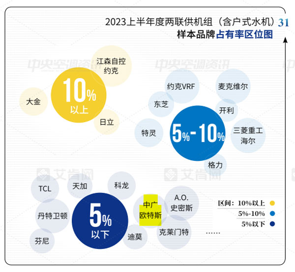 2023上半年,中廣歐特斯在渠道推廣和產(chǎn)品研發(fā)上不斷發(fā)力,兩聯(lián)供機(jī)組市場開拓取得了一定的成績,并在2023上半年度兩聯(lián)供機(jī)組(含戶式水機(jī))樣本品牌占有率上展示出一定的表現(xiàn)力,與科龍中央空調(diào)、天加、TCL智能暖通等國貨品牌并肩前行,占有率均為5%以下。