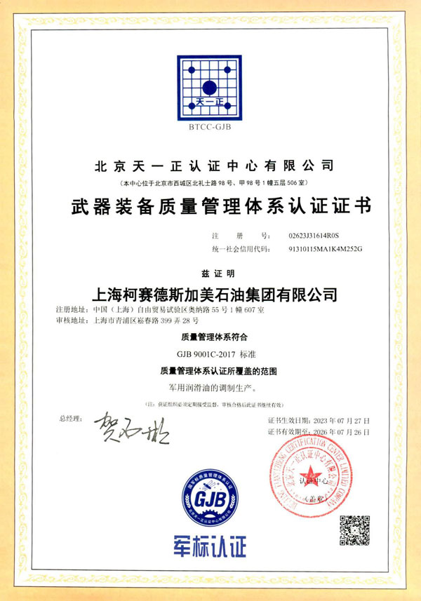 日前,上海柯賽德斯加美石油集團(tuán)有限公司在質(zhì)量管理、生產(chǎn)制程和技術(shù)創(chuàng)新方面再上新臺(tái)階,實(shí)現(xiàn)質(zhì)量管理體系認(rèn)證的重大突破,取得“武器裝備質(zhì)量管理體系認(rèn)證”證書。