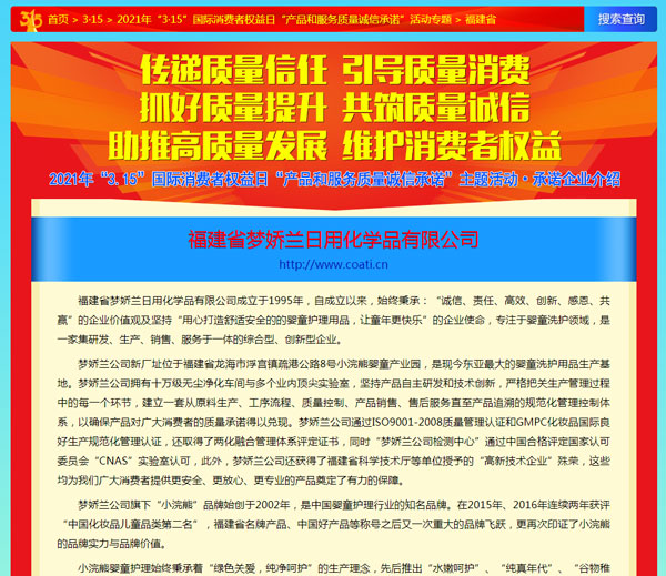 引導(dǎo)質(zhì)量消費(fèi),共筑質(zhì)量誠信,3月15日,由中國質(zhì)量檢驗(yàn)協(xié)會(huì)主辦的2021年“3.15”產(chǎn)品和服務(wù)質(zhì)量誠信承諾的主題活動(dòng)如期舉行,小浣熊作為“3.15”產(chǎn)品和服務(wù)質(zhì)量誠信承諾企業(yè),憑借匠心的品質(zhì)、優(yōu)質(zhì)的服務(wù)及良好的口碑,獲得協(xié)會(huì)以及權(quán)威專家的一致認(rèn)可,榮獲“全國產(chǎn)品和服務(wù)質(zhì)量誠信示范企業(yè)”,“全國質(zhì)量誠信先進(jìn)企業(yè)”、“全國質(zhì)量信譽(yù)保障產(chǎn)品”、“全國日化行業(yè)質(zhì)量領(lǐng)先品牌” 等多項(xiàng)榮譽(yù),《中國質(zhì)量報(bào)》、《中國消費(fèi)者報(bào)》及中國質(zhì)量網(wǎng)、中國經(jīng)濟(jì)網(wǎng)、中國消費(fèi)網(wǎng)等多家媒體均予以集中展示和公告。