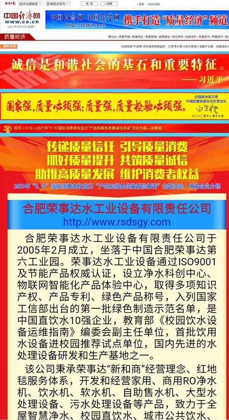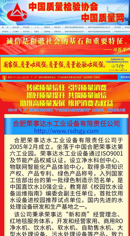 共筑質(zhì)量誠信,引導質(zhì)量消費。在由中國質(zhì)量檢驗協(xié)會主辦的2021年“3.15”國際消費者權(quán)益日“產(chǎn)品和服務(wù)質(zhì)量誠信承諾”主題活動中,榮事達憑借卓越的產(chǎn)品品質(zhì)及良好的社會形象,榮膺“全國產(chǎn)品和服務(wù)質(zhì)量誠信示范企業(yè)”“全國質(zhì)量信得過產(chǎn)品”“全國凈水行業(yè)質(zhì)量領(lǐng)先品牌”“全國質(zhì)量誠信先進企業(yè)”多項榮譽,《中國質(zhì)量報》、《中國消費者報》及中國質(zhì)量網(wǎng)、中國經(jīng)濟網(wǎng)、中國消費網(wǎng)等多家媒體均予以集中展示和公告。