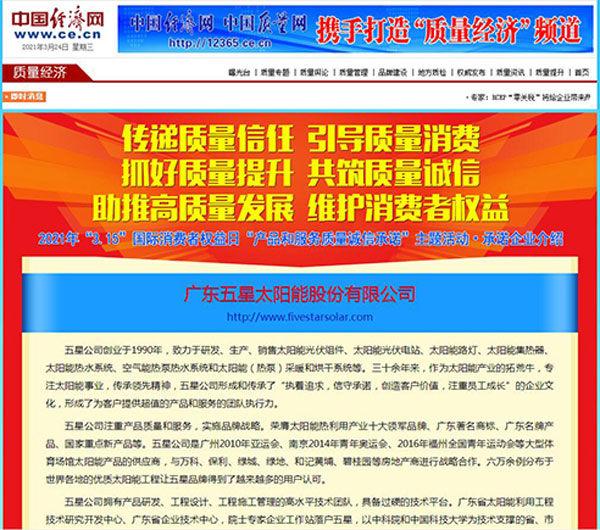 近日,在中國質(zhì)量檢驗協(xié)會舉辦的2021年“3·15”國際消費者權(quán)益日“產(chǎn)品和服務質(zhì)量誠信承諾”主題活動中,五星公司憑借一貫穩(wěn)定的產(chǎn)品質(zhì)量和優(yōu)良服務的口碑,被評為全國產(chǎn)品和服務質(zhì)量誠信示范企業(yè);五星品牌下的五星光伏電站、太陽能(熱泵)熱水系統(tǒng),從眾多企業(yè)中脫穎而出,被評為全國質(zhì)量檢驗穩(wěn)定合格產(chǎn)品。